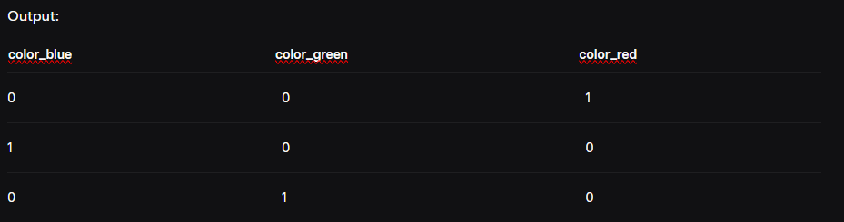 One-Hot Encoding: Creates binary columns for each category. For example, “color” becomes three columns: