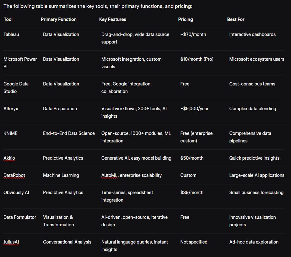 As we navigate 2025, no-code tools continue to evolve, incorporating advanced AI features like natural language processing and automated machine learning (AutoML). This article highlights the most prominent tools, categorized by their primary functions, to help data analysts choose the right solutions for their needs.